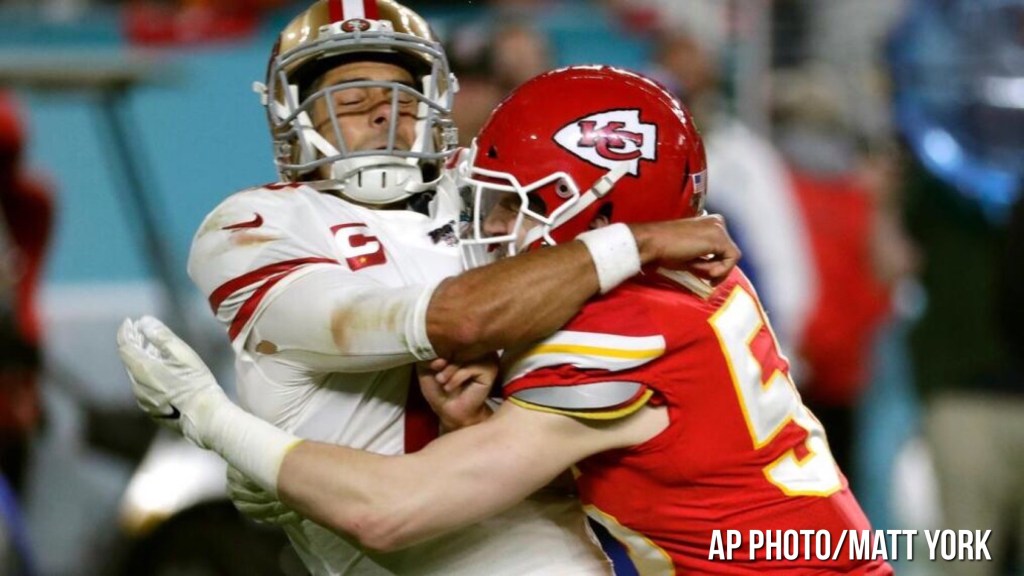 In the 4th Quarter, the game was 20-10, in favor of the Niners. With under 10 minutes left, Jimmy G had the chance to seal the game. On 3rd and 14th, on their own side of the field, with a shot to get into field goal range, before the snap, Chiefs defensive end Tanoh Kpassagnon, jumped offside. On that same play, cornerback Rashad Fenton was guilty of a helmet-to-helmet hit on Garoppolo. Referee Bill Vinovich waved off both.